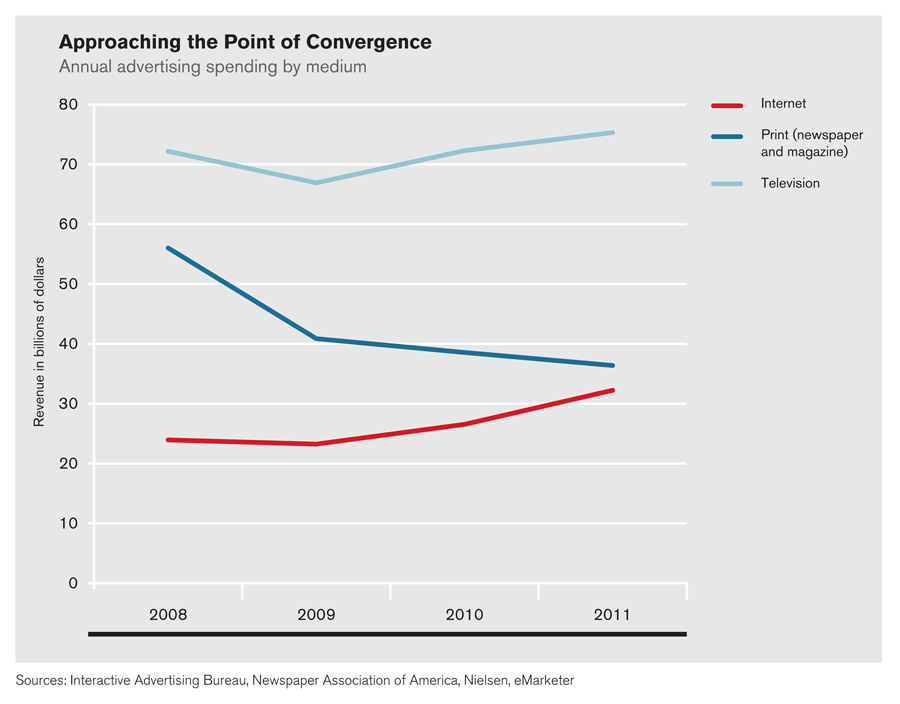 Meanwhile, television ad spending—which Nielsen reports was nearly $75 billion in 2011—continues to dwarf both.